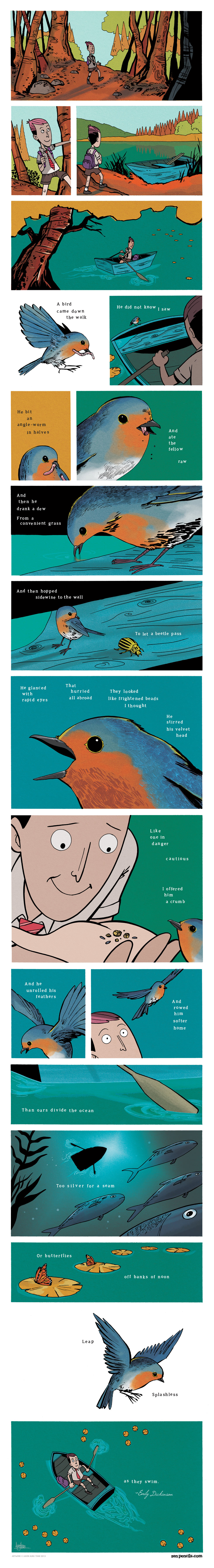 The bird’s frightened, bead-like eyes glanced all around. Cautiously, the speaker offered him “a Crumb,” but the bird “unrolled his feathers” and flew away—as though rowing in the water, but with a grace gentler than that with which “Oars divide the ocean” or butterflies leap “off Banks of Noon”; the bird appeared to swim without splashing.